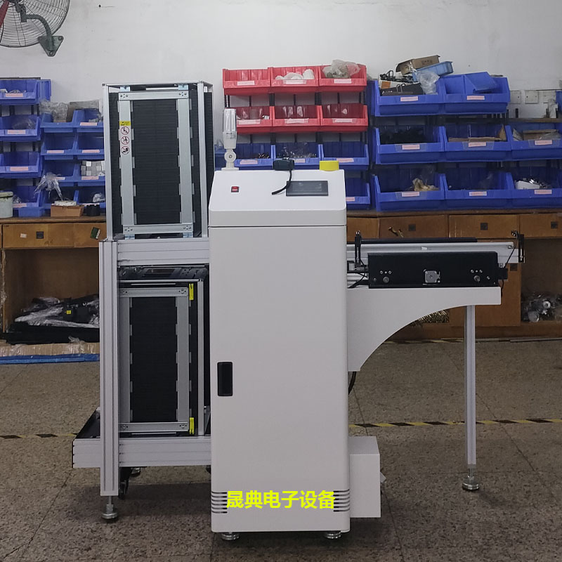 SMT全自动收板机(Unloader)PCB下板机,SMT收料机,PCB下料机,广泛应用于SMT生产线的末端,将前面设备传送过来的板逐一收进料箱内而实现収板功能,它的収板板动作是通过接收前面设备信号后做出的动作,若Unloader机已全部收完板则它又会反制前面设备停止工作,并发出声光报警,它也可以为某一个单独的SMT设备实现收板功能。与之对应的是PCB全自动上板机,位于SMT生产线的前端。